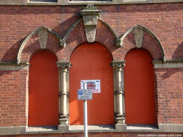 These are the central windows on the ground floor of the western end of the building. Even with the windows boarded up, the decorative stonework and tapering brickwork look magnificent in the sunshine.